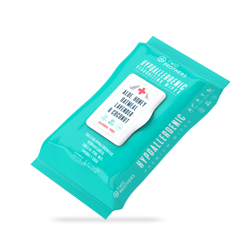 Two Brothers Hipoallergenic Wipes son unas toallitas hipoalergénicas desodorizantes con Aloe Vera, Miel, Avena, Lavanda y Coco. Fórmula libre de Alcohol, Parabenos y Fragancias, que ayuda a limpiar, hidratar y calmar, mientras deja un fresco aroma.